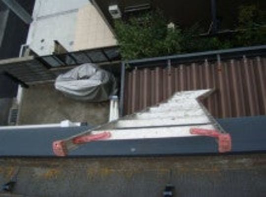 物置をあるベランダや狭い内樋があり手間がかかる建物です。