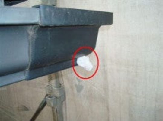 足場を組む時に雨樋にぶつけてしまい 穴が開いてしまったので直してほしい とのことで見に行ったら開いた穴に 発泡材?をつめていました。...